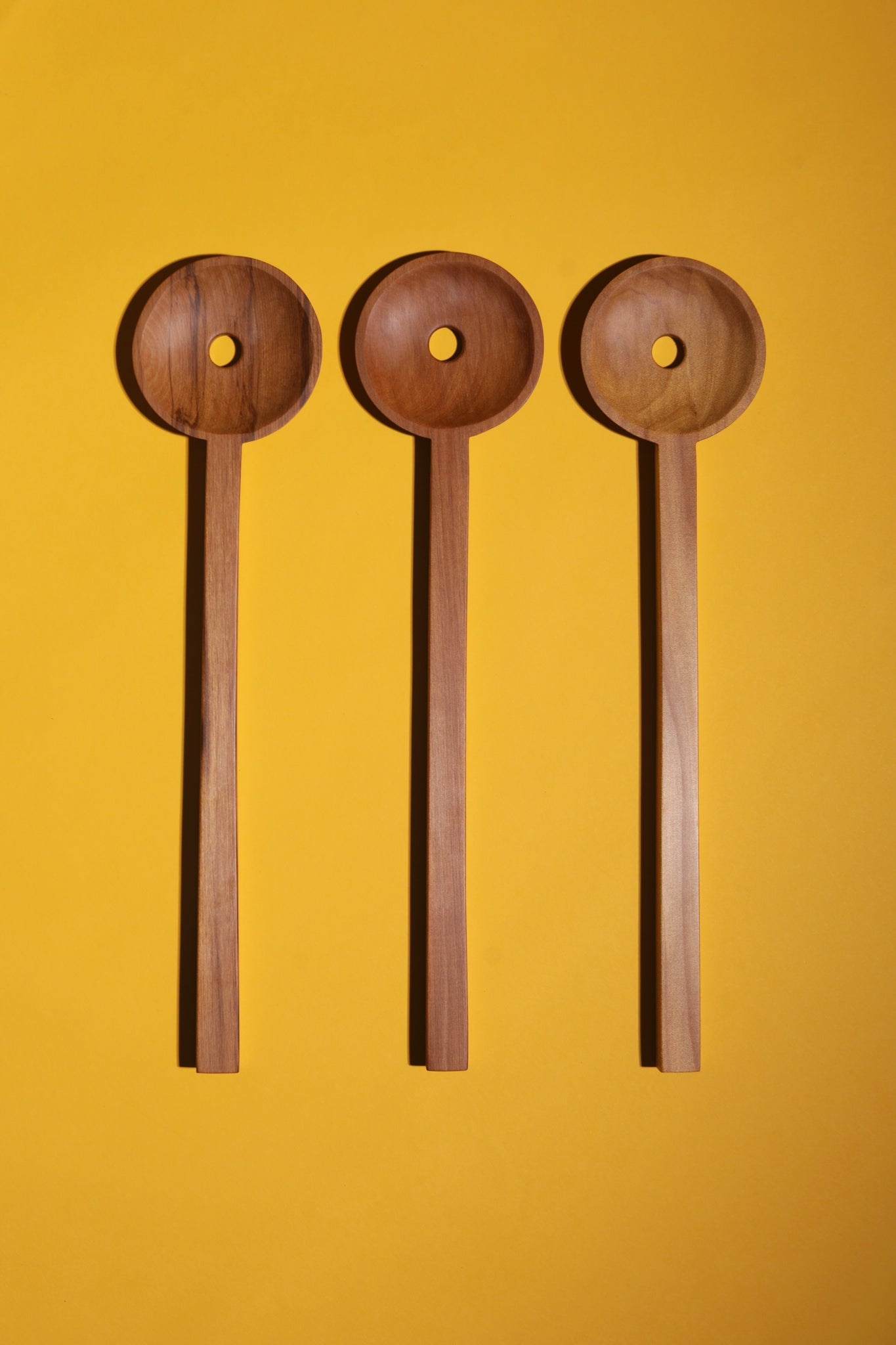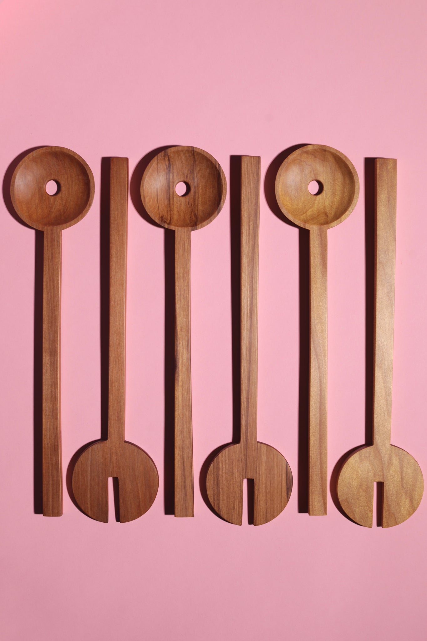 Enjoy serving up salads with these Round Salad Servers. Handmade from native New Zealand timber, these elegant servers are perfect for tossing and serving salads with ease. Their smooth, ergonomic and geometric design ensures a comfortable grip and precise handling, while the rich native timber finish adds a touch of artisanal beauty to your table setting. Each piece is meticulously crafted for durability and style, making them a must-have for any kitchen and table.