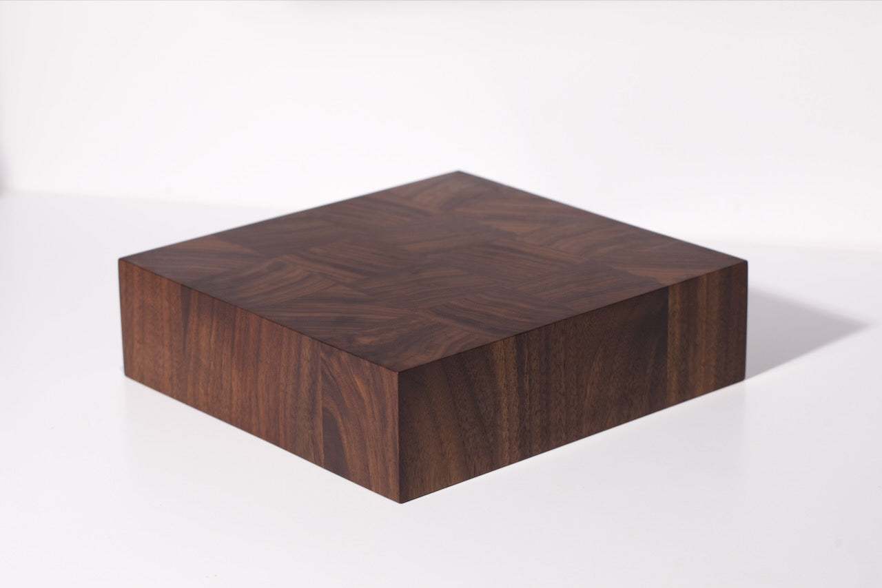 This release is made from walnut, selected for its depth of colour and density. The boards are composed of chunky 70 mm square blocks, arranged in a solid 4 × 4 formation that creates a woven, graphic pattern across the surface.