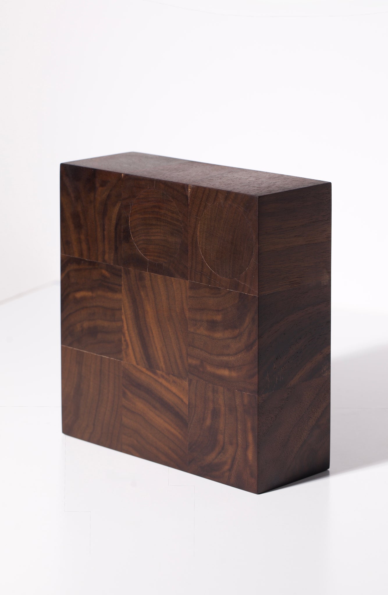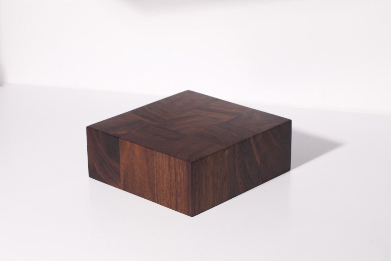 This release is made from walnut, selected for its depth of colour and density. The boards are composed of chunky 70 mm square blocks, arranged in a solid 4 × 4 formation that creates a woven, graphic pattern across the surface.