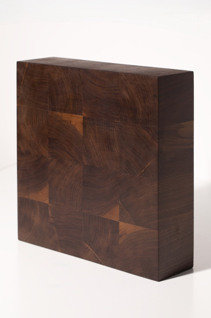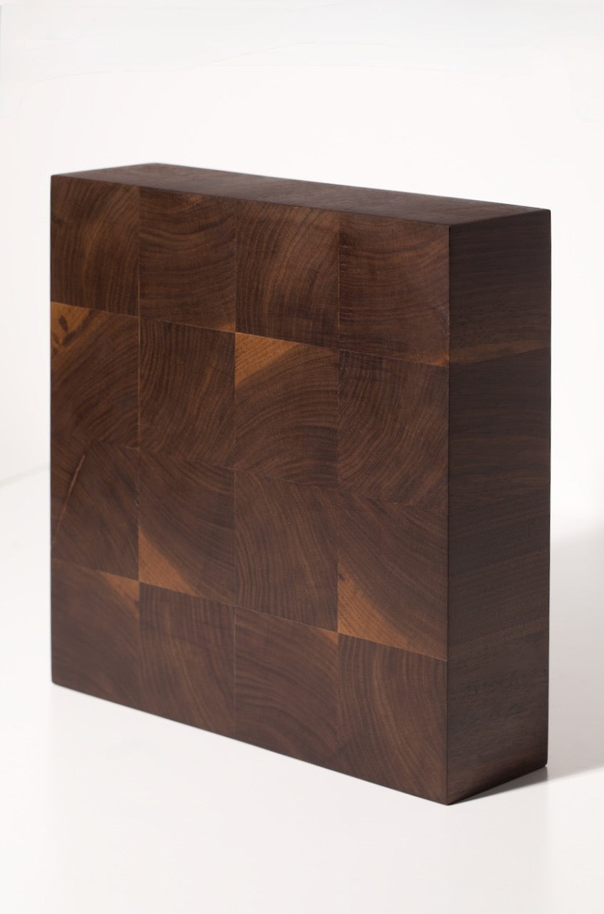 This release is made from walnut, selected for its depth of colour and density. The boards are composed of chunky 70 mm square blocks, arranged in a solid 4 × 4 formation that creates a woven, graphic pattern across the surface.